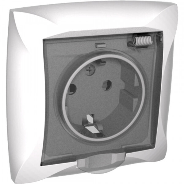 РОЗЕТКА С З/К СО ШТОРКАМИ С КРЫШКОЙ IP44, БЕЛЫЙ