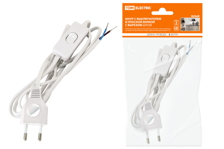 TDM Шнур с выключателем и плоской вилкой с вырезом ШУ03В ШВВП 2х0,75мм2 2 м. белый