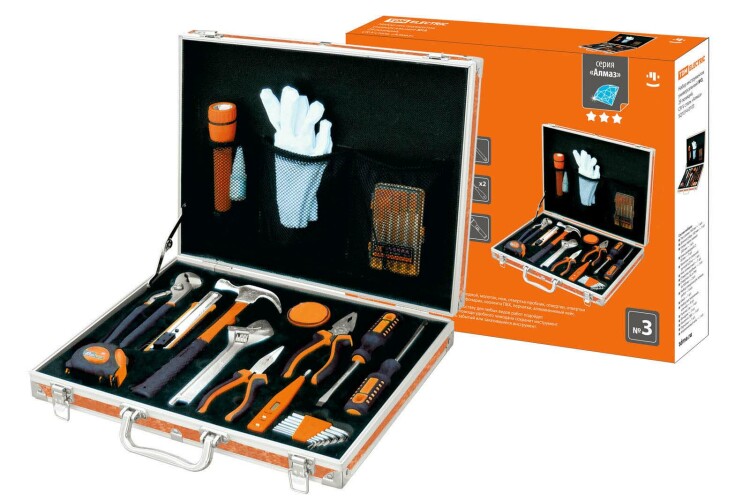 Материалы:Чемодан, рукоятки ПВХ, мягкая резина, алюминий.Металлические части состава инструментальная и хром-ванадиевая сталь. Преимущества:Качественная сталь.Оптимальное сочетание инструментов в набореУдобное хранение необходимых инструментовИнструменты в наборе выдерживают повышенные нагрузкиИнформативная красочная упаковка со штрихкодом наглядно представляет содержимое набораНазначение:Наборы предназначены для выполнения широкого круга работ при ремонте, монтаже, регулировке машин и различного оборудования. 0: Материалы:Чемодан, рукоятки ПВХ, мягкая резина, алюминий.Металлические части состава инструментальная и хром-ванадиевая сталь.