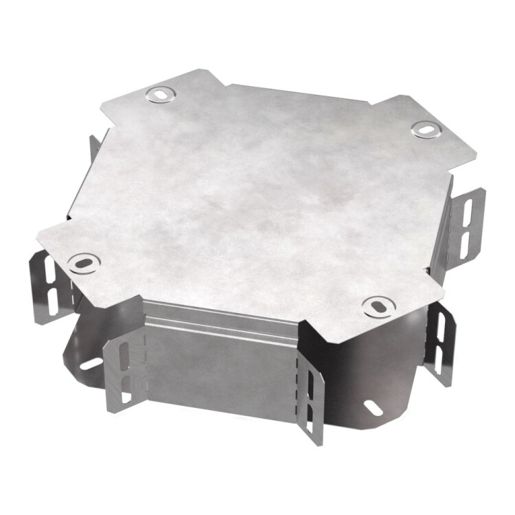Аксессуары изготовленные из стали с защитным покрытием по методу Сендзимира – это изделия, на которых защитное цинковое покрытие было нанесено на листовую сталь перед изготовлением. Толщина защитного покрытия варьируется от 10 до 22мкм. Климатическое исполнение изделий УХЛ2, что предусматривают эксплуатацию в помещении и под навесом, при температуре эксплуатации от -80 до +150°С. Ответвитель X-образный предназначен для разветвления кабельных трасс в горизонтальном направлении, для перфорированных и глухих лотков. В комплект входит крышка.