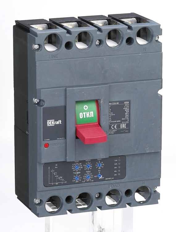 Автоматический выключатель серии ВА-334 АЕ DEKraft; 4P; номинальный ток 400 А, отключающая способность Icu = 70 кА (при 415 В 50 Гц); расцепитель and ndash; электронный; регулируемые уставки тока (Ir, Isd, Ii) и времени срабатывания (tr, tsd). В комплект поставки входят 4 межфазные перегородки и крепеж на монтажной плате. Электронный расцепитель с широким диапазоном регулирования уставок тока и времени позволяет применять выключатель для защиты разных нагрузок.