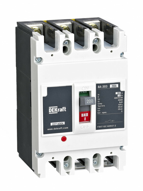 Автоматический выключатель в литом корпусе серии ВА-302L DEKraft; 3P; номинальный ток 200 А; откл. способность Icu = 40 kA (при 400 В пер.тока); уставка мгновенного срабатывания Ii = 5In. В комплект поставки входят 4 межфазные перегородки и крепеж на монтажной плате. Выключатели имеют компактный размер (на 10-15% меньше по сравнению с аналогами), что экономит место в распределительном щите. Уставка срабатывания 5хIn обеспечивает чувствительность к токам КЗ в конце линий большой длины.