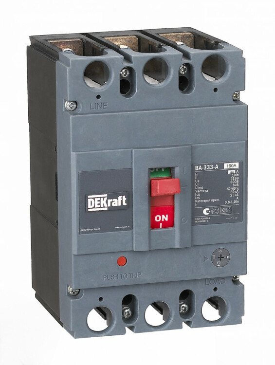 Автоматический выключатель серии ВА-333 DEKraft; 3P; номинальный ток 160 А, отключающая способность Icu = 50 кА (при 415 В 50 Гц); расцепитель and ndash; термомагнитный, регулируемый. В комплект поставки входят 4 межфазные перегородки и крепеж на монтажной плате. В дополнение к выключателям выпускается ряд аксессуаров, расширяющих их функционал: сигнальные контакты, расцепители напряжения, моторные приводы, шины выносные и др.