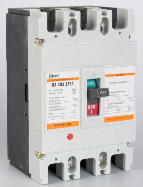 Автоматический выключатель в литом корпусе серии ВА-303 DEKraft; 3P; номинальный ток 125 А; откл.способность Icu = 30 кА (до 690 В пер.тока); расцепитель and ndash; термомагнитный, нерегулируемый. В комплект поставки входят 4 межфазные перегородки и крепеж на монтажной плате. В дополнение к выключателям выпускается ряд аксессуаров, расширяющих их функционал: сигнальные контакты, расцепители напряжения, моторные приводы, шины выносные и др.