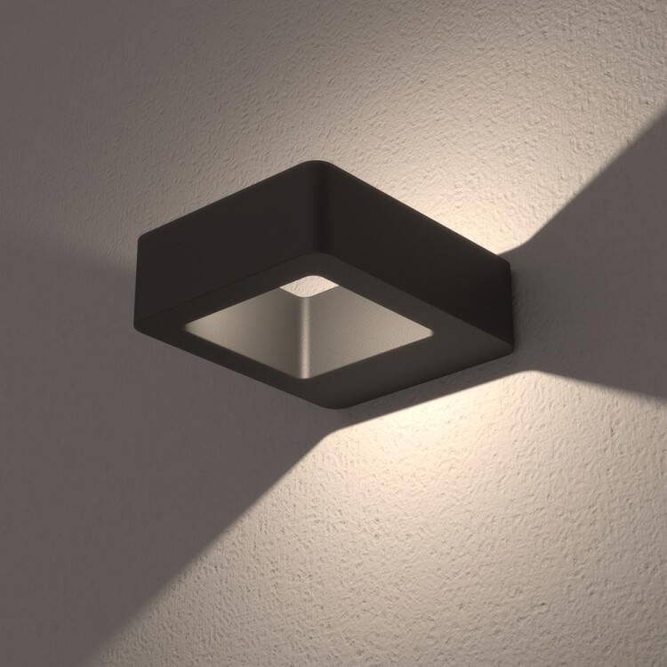 Уличный светодиодный светильник для стен, освещение вверх-вниз. Цвет ТЕПЛЫЙ БЕЛЫЙ 3000К, угол 92°, светодиод 7Вт CREE (357 лм). Влагозащищенный корпус IP54 - черный алюминий, экран ударопрочный PC. Питание 220В, мощность 7 Вт. Размеры ВхШхГ 45х120х145 мм.