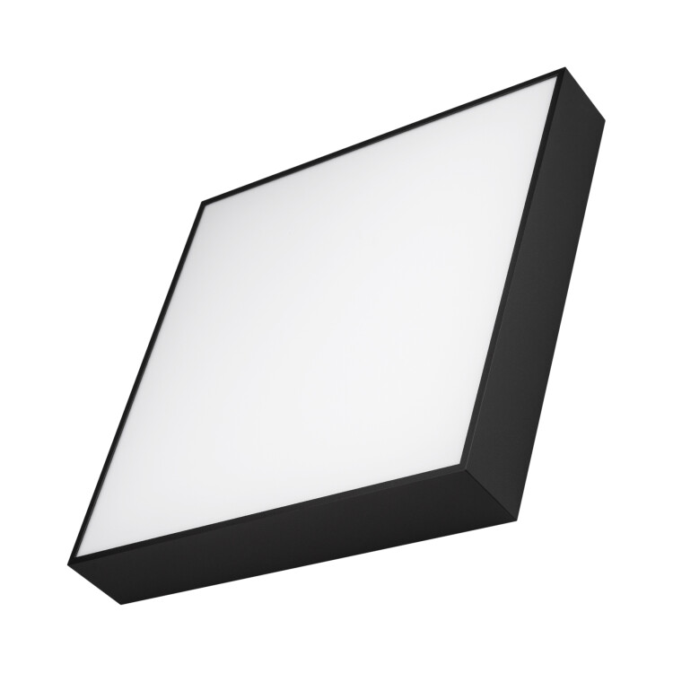 Накладной светильник. Мощность 40 Вт, св. поток 2590-3200 лм, 80 лм/Вт, дневной 4000 K, CRI>90, угол 120°, напряжение питания 230 В. Черный квадратный корпус из алюминия, экран PC, степень защиты IP40. Размер: длина 400 мм, ширина 400 мм, высота 64 мм. Монтаж накладной. Драйвер 27-40 В, 1000 мА, пульсация
