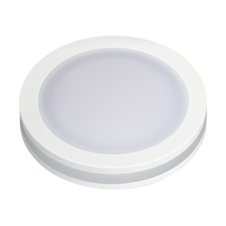 Круглый светильник с контурным свечением. Корпус IP20 белый + вставка поликарбонат PC. Цвет БЕЛЫЙ ТЁПЛЫЙ 3000К, св.поток 400 лм, угол 120°+180°. Питание 180-240VAC (драйвер в к-те 300mA 11-25V), мощность 5Вт. Размеры 80х40 мм, установка в отв.65 мм, высота мин.40 мм.